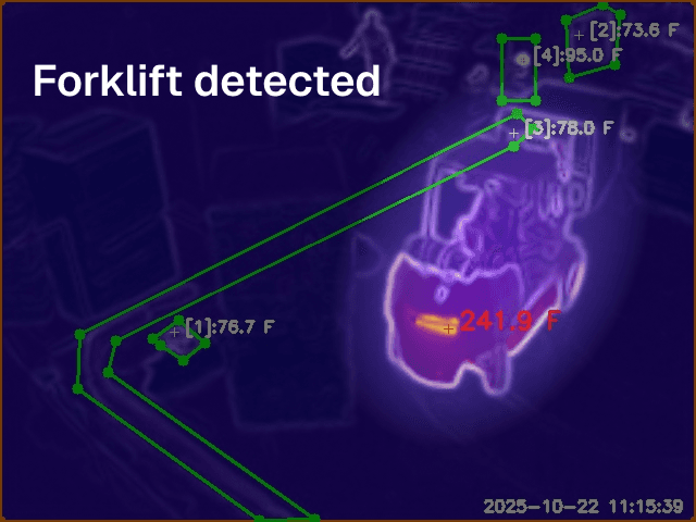 Kameras filtern Bewegungen und irrelevante Wärmequellen – wie Gabelstapler oder Personal – heraus, sodass nur stabile, gerätebezogene Temperaturänderungen eine Auswertung und Warnungen auslösen.