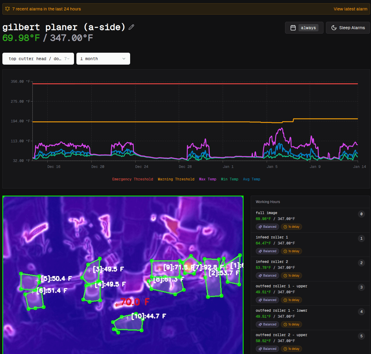 There's a new way to run a planer and that's with AVIAN's planer monitoring system. AVIAN monitors Gilbert planers all around the world, with customers like Sierra Pacific Industries, Mercer Timber, Mission Forest Products, and many others. The AVIAN system offers analytics that help you identify anomalies in temperatures BEFORE failure. Our predictive maintenance algorithms and 24/7 monitoring team ensure that you stay producing.